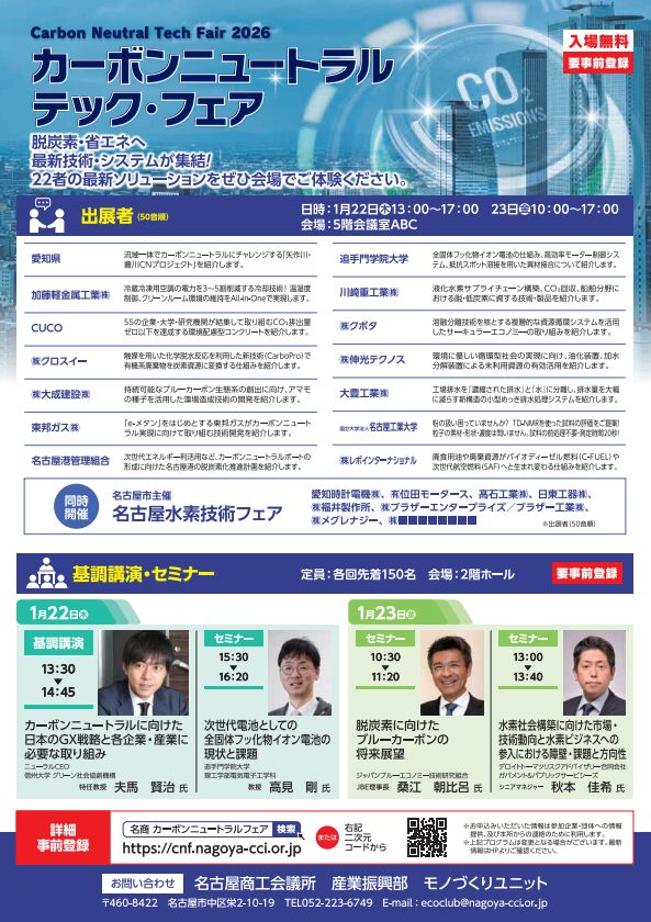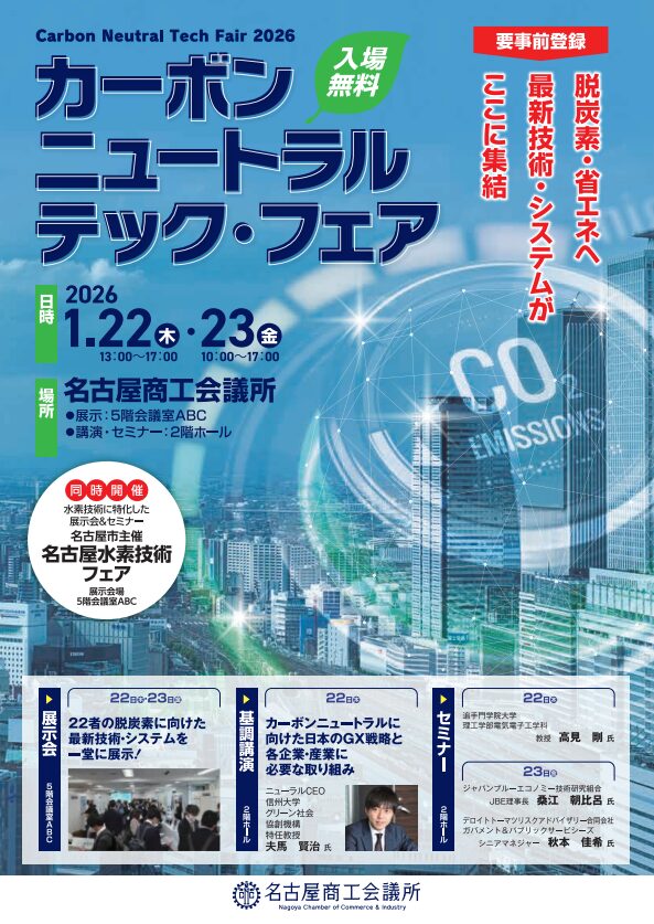 このたび当社は、名古屋商工会議所主催のイベント「カーボンニュートラルテック・フェア」にブース出展いたしました。 本イベントは2日間にわたり開催され、行政関係者をはじめ、製造業・飲食業など、非常に幅広い業種の皆さまにご参加いただき、会場は終始活気にあふれていました。
